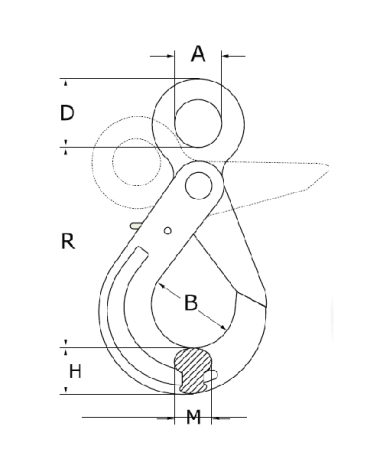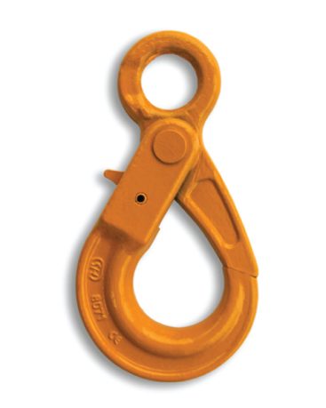 Eye Self-Locking Hooks remain open until the load is engaged and automatically lock under load, preventing accidental opening. The hook can only be released by pressing the trigger. The eye design allows easy connection to chain connectors, shackles, and wire rope slings.